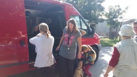 Pünktlich um 11.00 Uhr kam noch der zuständige Amtstierarzt, um den Transport zu überprüfen und uns freie Fahrt zu geben. Bevor die Hunde verladen wurden, teilten wir noch das mitgebrachte Futter auf Mohacs und Szeged auf, diesmal war einiges an Leckerlies dabei, aber auch jede Menge an Trockenfutter, das bei je 200 Hunden icht lange auf Lager liegen wird.